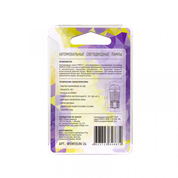 • Автолампа светодиодная 24V T10 WHITE 5500K FIREFLY W5W55UN-24 MTF